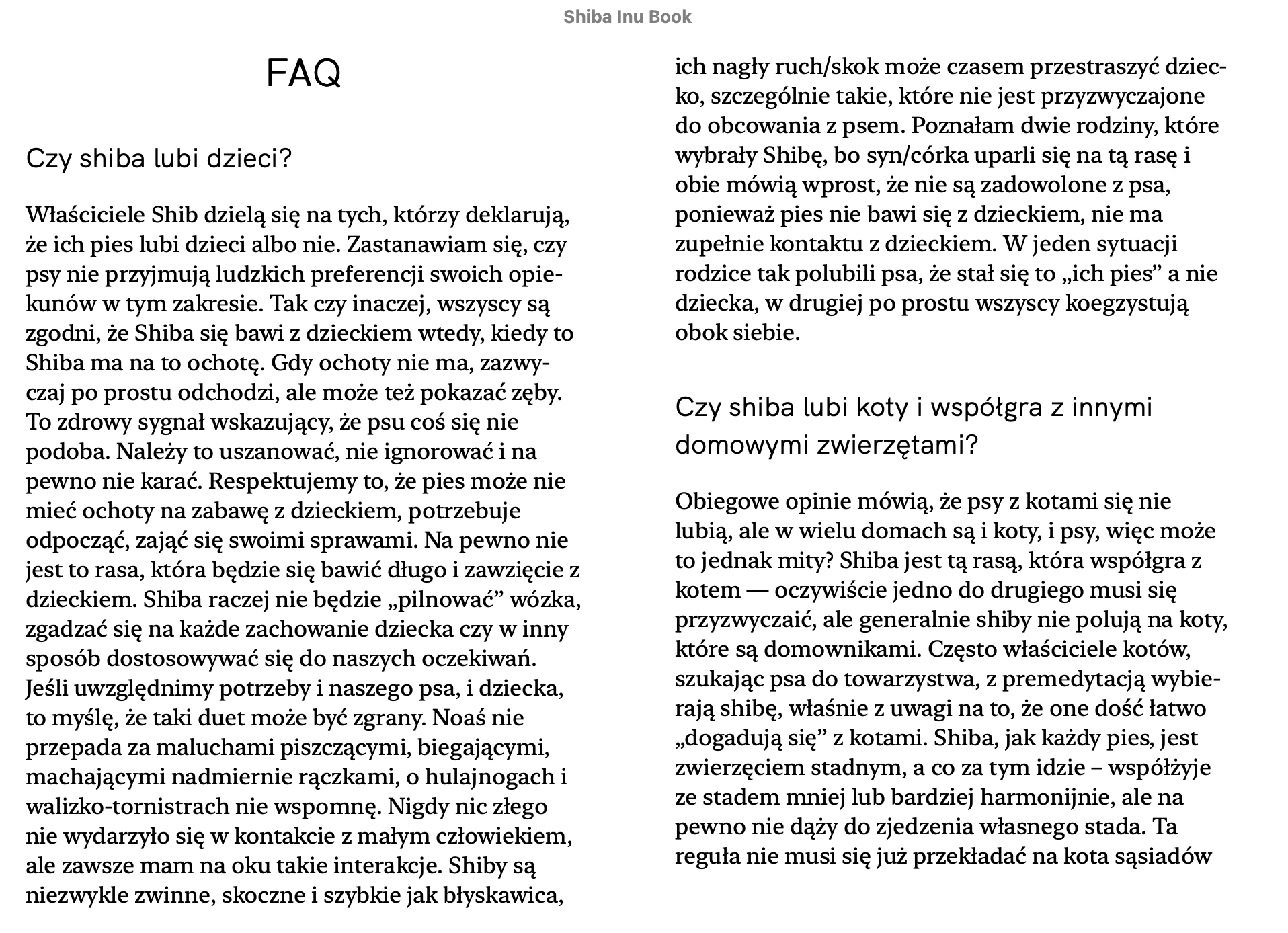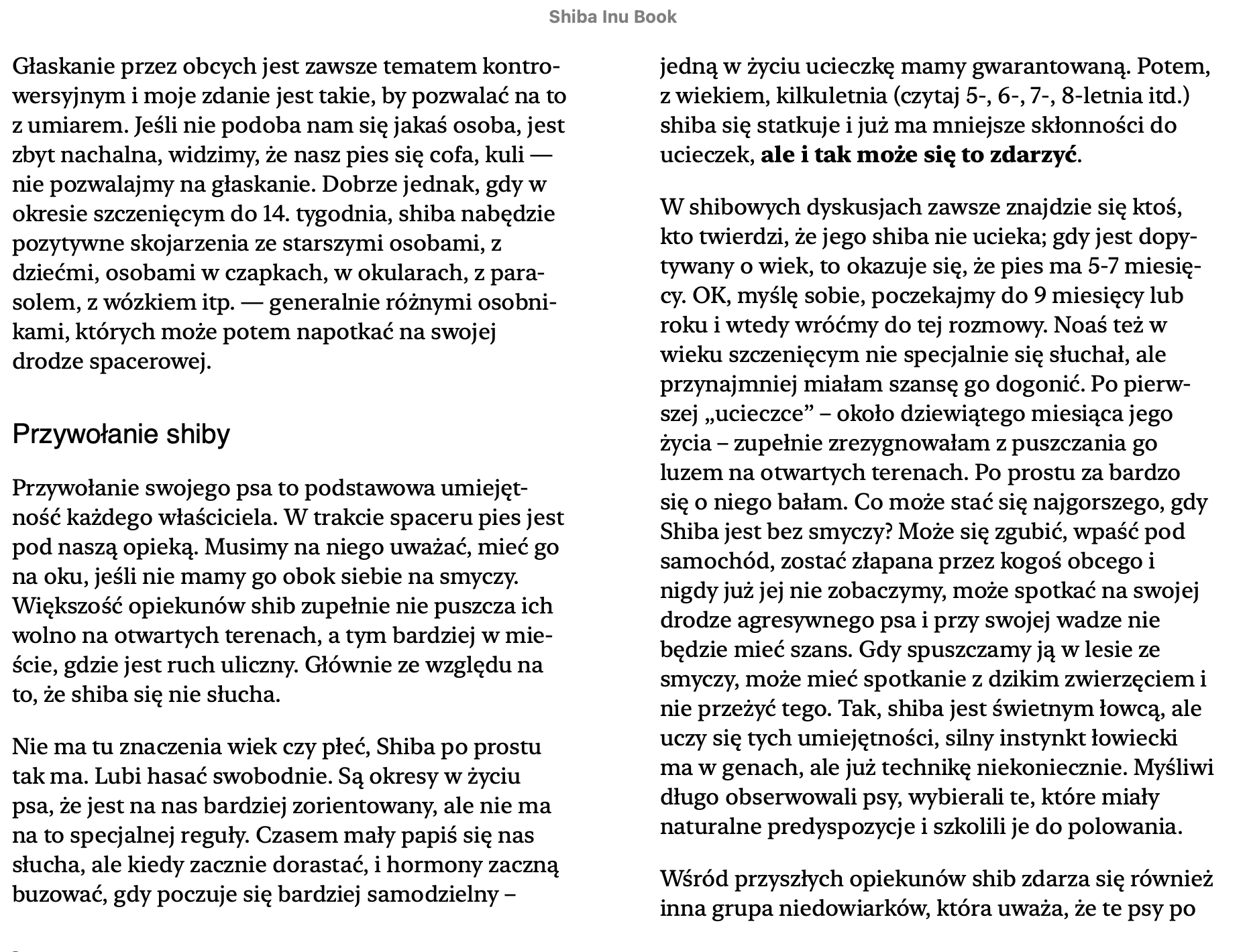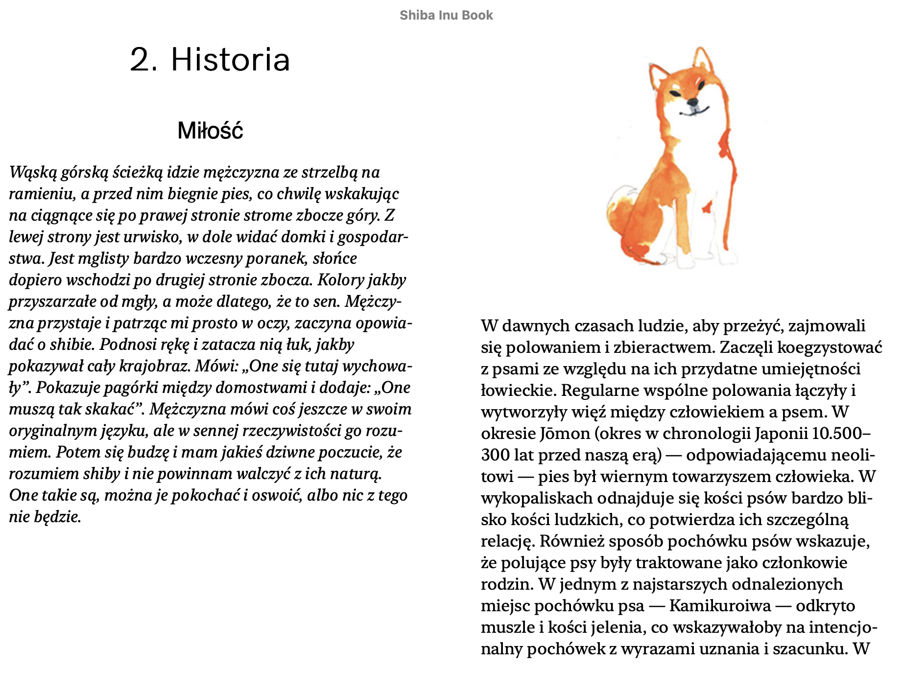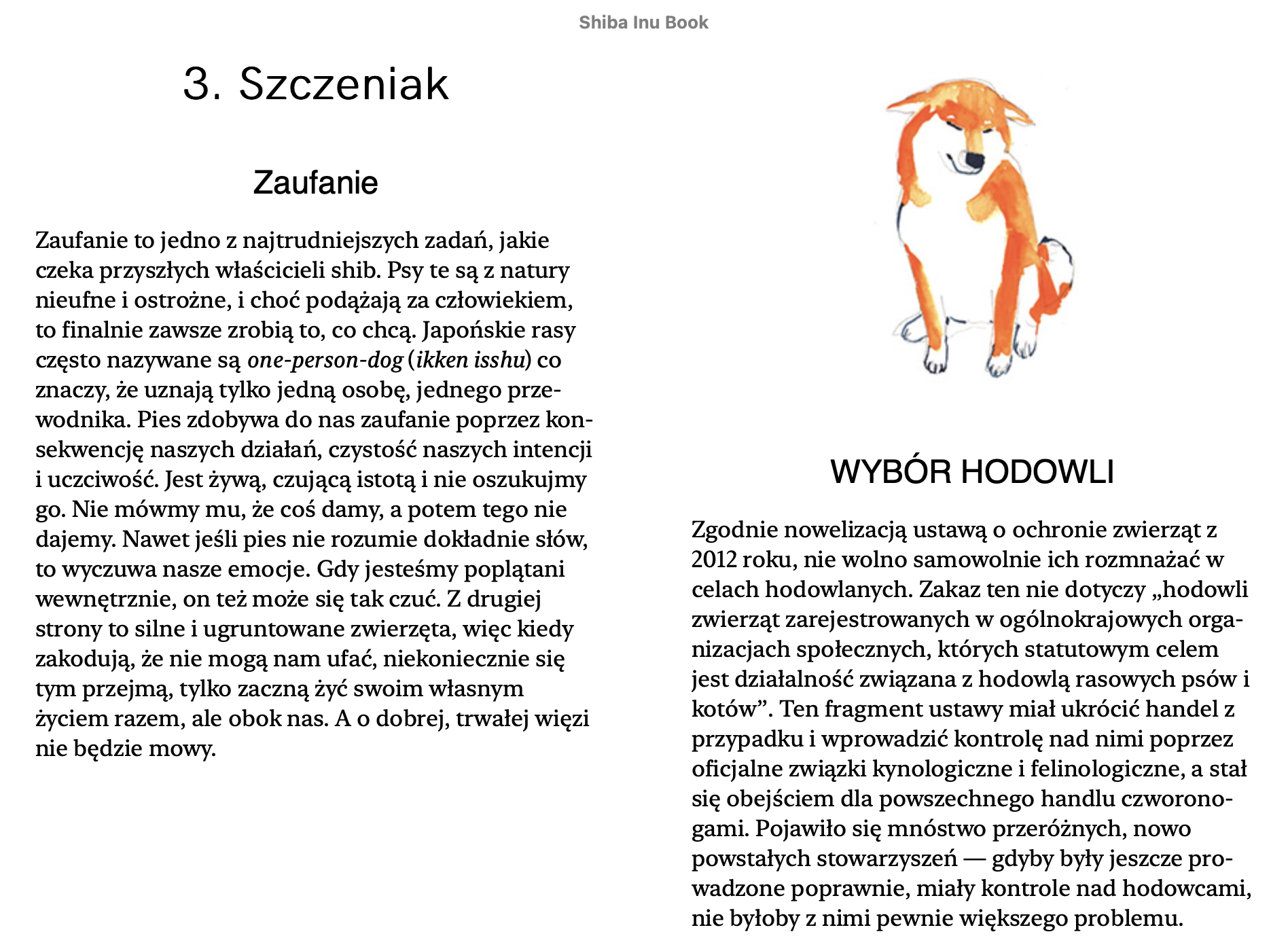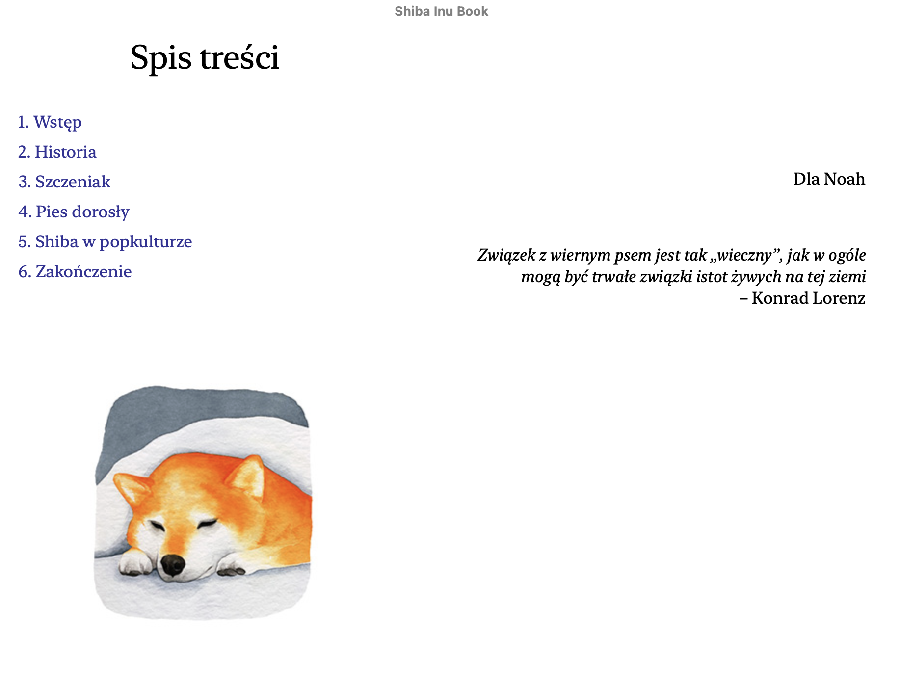 Pierwsza po polsku książka o o japońskiej rasie psów Shiba. Pierwsze wydanie książki „Moja Shiba” ukazało się w 2019 roku, drugie wydanie uzupełnione i poprawione w 2021. Książka to kompedium wiedzy o Shibie. Napisałam ją bazując na doświadczeniu z moim psem Noasiem, a także wielu tekstach, książkach, blogach i forach głównie anglojęzycznych. Kiedy w moim domu w 2013 roku pojawi się Noah, nie było praktycznie żadnej wiedzy o Shibie, dlatego zaczęłam sama zbierać informacje. Książka jest napisana prostym językiem, zawiera sześć rozdziałów: Wstęp, Historia Rasy, Szczeniak, Pies Dorosły, Shiba w Popkulturze, Zakończenie. W książce znajduje się też sekcja FAQ – odpowiedzi na najczęstsze pytania oraz podrozdział Zdrowie. Wszystkie nakłady wydań papierowych zostały wyprzedane. Książka jest w wersji eletronicznej EPUB. W środku znajdziecie też piękne akwarele i grafiki Anny Sitnikowy.
